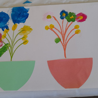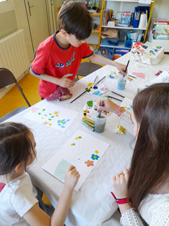 Puis les enfants accompagnés des mamans et grands parents pour certains se sont installés autour des tables afin de réaliser une oeuvre sur le thème du jardin en fleurs.